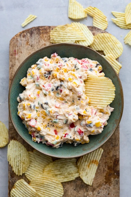 ترکیب این مواد در این دیپ خامه ای، طعم و بافتی بی نظیر ایجاد می کند. این دیپ شامل فلفل دلمه ای قرمز، زیتون، ذرت و فلفل هالاپینو برای افزودن کمی تندی است.
