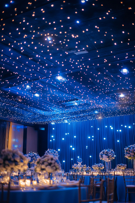 هماهنگی آبی و سفید: ترکیبی عالی از نورپردازی سرد و گل‌آرایی‌های نرم.